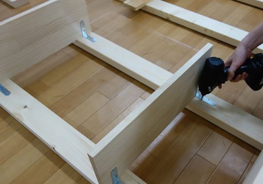 L字金具は先に「棚板」に取り付けましょう。次に「2×4材」へ固定します。
