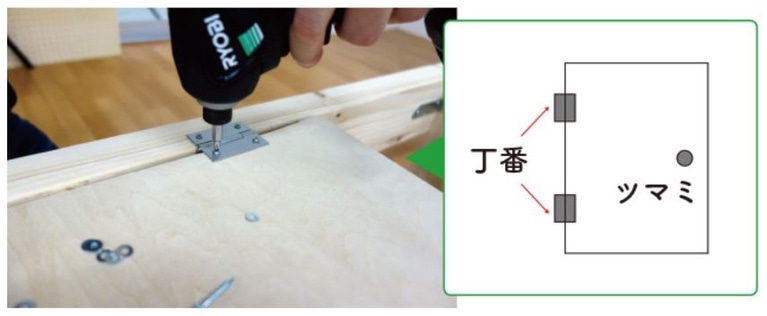 2×4材とベニヤ板に丁番を取り付けます。2×4材はビスで固定、ベニヤ板はさら小ねじ・ナットで固定します。丁番と反対側にツマミを固定します。