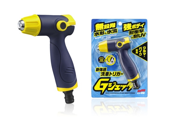 洗車をとことん楽しみたい人必見。<br><br>「オール金属制散水ノズルってクルマのボディにキズをつけやすいかも…」「洗車専用で操作性と耐久性の高い散水ノズルが欲しい」などのユーザーの声もとに開発されたGジェッター。<br><br>水道水圧をできる限り落とさずに噴射でき、水圧で固着した泥汚れを落とすことができて、しかも、繰り返し落としても壊れにくい高耐久構造の洗車専用の散水ノズルを開発しました。<br><br>お持ちのホースリールに取り付けるだけですぐに洗車ができ、「水形」「水流」の両方を無段階に調節・組み合わせることで、ボディのすすぎ洗いからパーツの洗浄、鉄粉取り作業まで、洗車の工程やパーツ形状に合わせ最適な洗車をお楽しみいただけます。<br><br>洗車中うっかり落としても壊れにくい頑強ボディを採用、手にフィットする3Dフォルムとシャンプーが付いた手で持ってもすべりにくいエラストマー樹脂との相乗効果で、洗車中もしっかりとグリップできます。