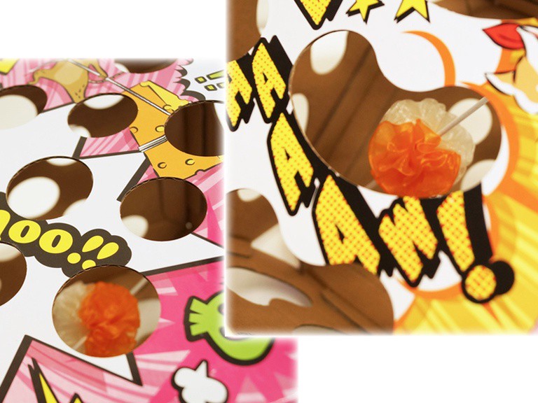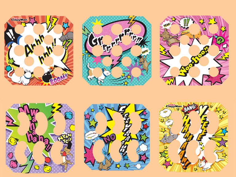 ド派手なデザイン。25㎝四方の、穴だらけの大きく軽い段ボール箱です。