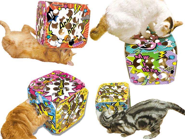 箱の穴の向こう側にあるゴムひもで引っ張られたおもちゃが猫ちゃんの本能をむき出しにします!