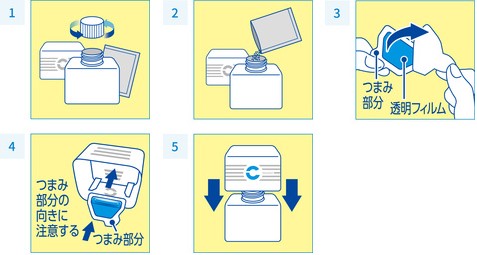 (1)ボトルに使用開始日を記入する。白色キャップを取る。(ボトルを水平にして、ボトル内の液体をこぼさないよう注意する。)
