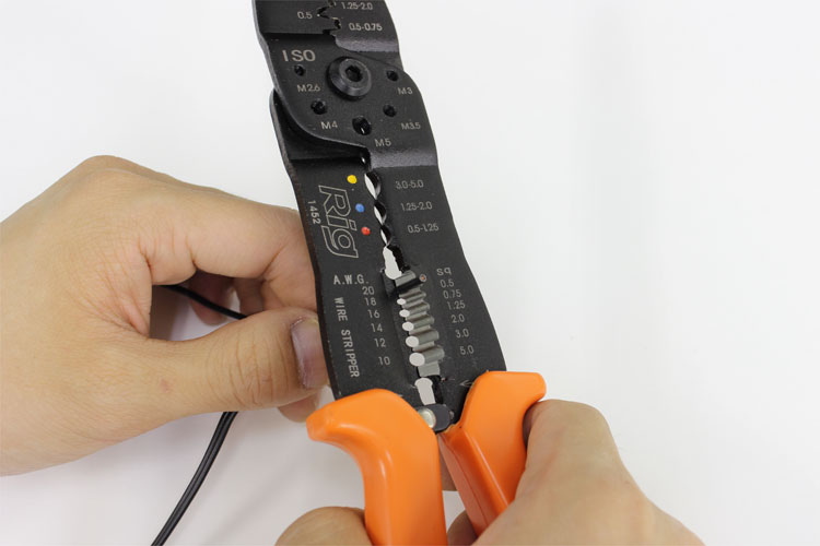 コードの被覆を取る電工ペンチのWIRE STRIPPER部分を使用してコードの先端の被覆を取り芯線を出します。