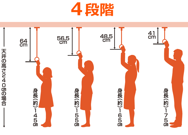 ポールの取り付けサイズは64㎝、56.5㎝、48.5㎝、41㎝と4段階で調節可能。使用場所や使用する人の状況に合わせて、思い通りの快適な室内干しスペースが作れます。