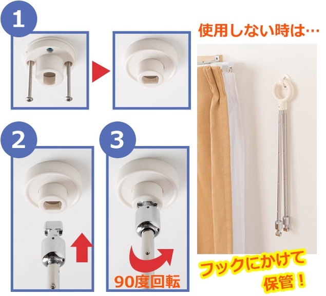 使い終わったら、ポールを左右のどちらか90度に回せばロックが解除され、取り外せます。外したポールは、フックなどにかけて保管できます。