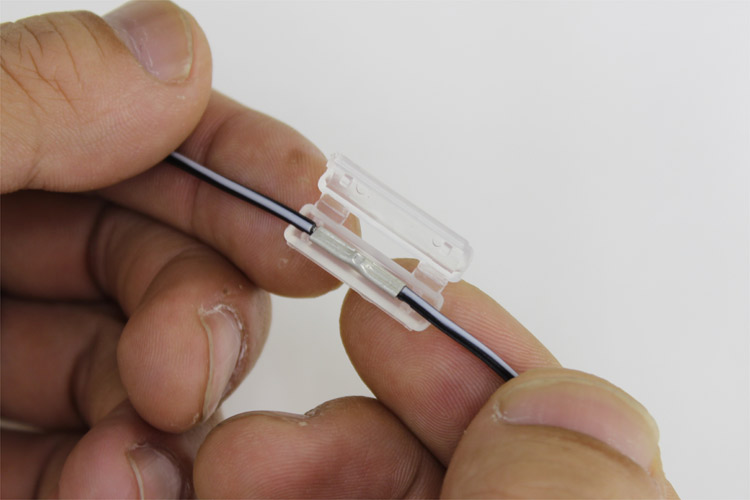 カバーには端子がずれないよう溝があるので、その溝にはめこんで位置決めする。