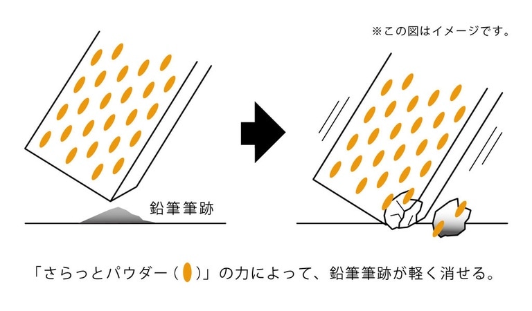 今回の「アイン サラ」では、そのための強度対策がしっかりととられている。消しゴムの中に「さらっとパウダー」という粉末粒子を配合しているのだ。このパウダーはちょっと特長があって、ひとつひとつの形がちょうどラグビーボールのような形をしている。これを消しゴムの長手方向にあわせてまんべんなく配合している。しかも、これが消しゴムの骨組みのような働きをして、4.5mmとスリムであってもしなりにくくなっている。
