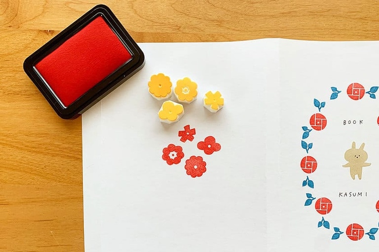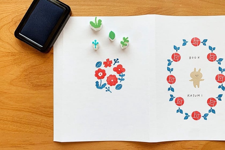 消しゴムはんこ(今回はうさぎ、お花と葉っぱの模様を作成)