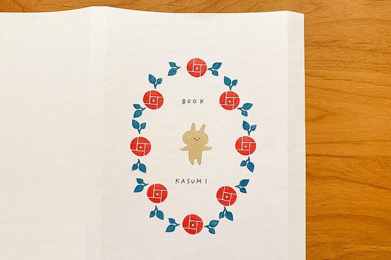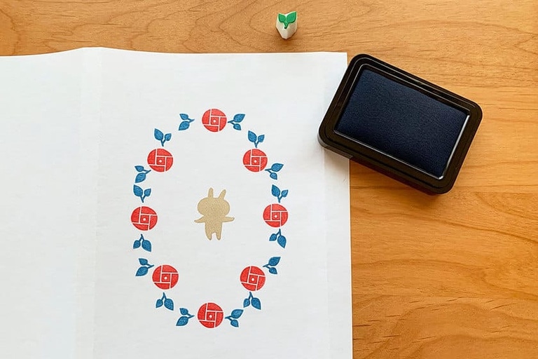 2.真ん中にうさぎのはんこを押してから周りにぐるっとバラのはんこを押す。