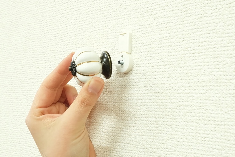 ホームセンターなど販売されている、取っ手つまみを利用した、デザインをいつでも交換できるフックを開発。最小限の穴で耐荷重をしっかりと取れる設計を試行錯誤しました。