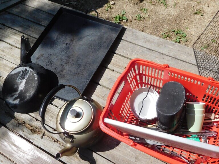 収納ケースとは別に使用済みの食器を入れるかごがあると、そのまま水場まで運べて便利でしょう。