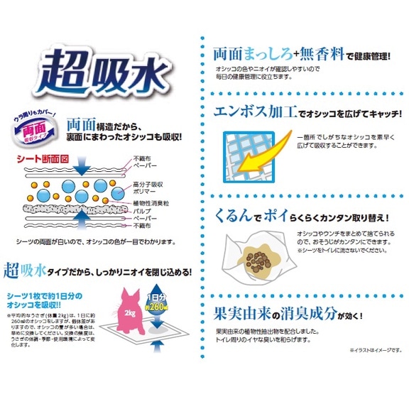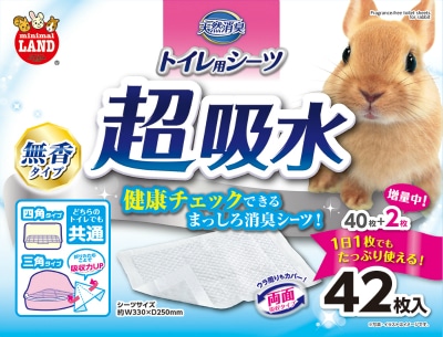 両面吸収タイプでウラ周りをカバーする超吸水うさぎ用トイレシーツ。<br>健康チェックに適した真っ白な無香タイプです。<br>