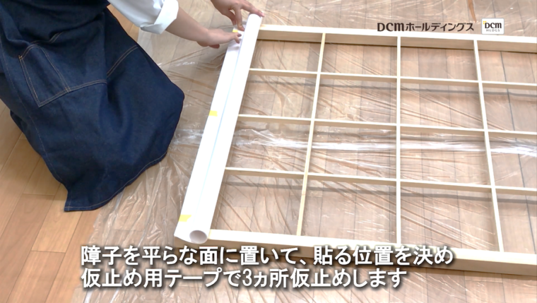 障子を平らな面に置いて貼る位置を決め、マスキングテープなどで仮止めします。仮止めした後、障子紙を1回広げてみて、斜めになっていないか、曲がっていないか確認します。