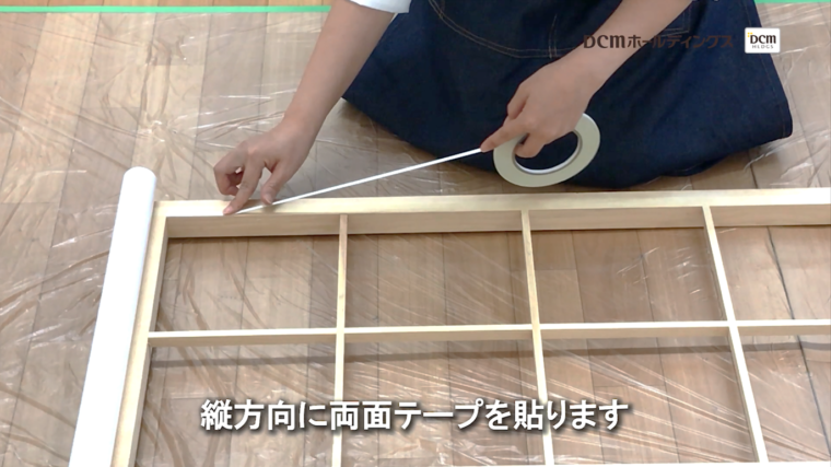 仮止めした障子紙を枠の片側に巻いたまま置いておき、障子枠の縦方向に専用両面テープを貼っていきます。この時、枠の内側ギリギリに貼りましょう。枠に段差がある場合は、段差部分に両面テープを貼るのがポイントです。縦方向にすべて貼り終わったら、裏紙をはがしておきます。