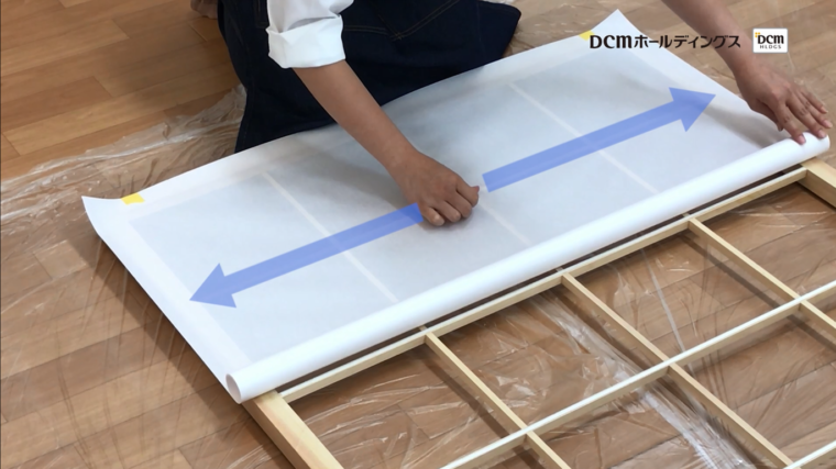 横方向の両面テープの裏紙を1枚ずつはがしながら、枠の外側に巻いてあった仮止めした障子紙をクルリと転ばしながら、貼っていきます。内から外に向かって指で押さえて、しっかりと貼りつけましょう。貼った分の縦方向にももう一度指で押さえて、貼りつけを確認します。
