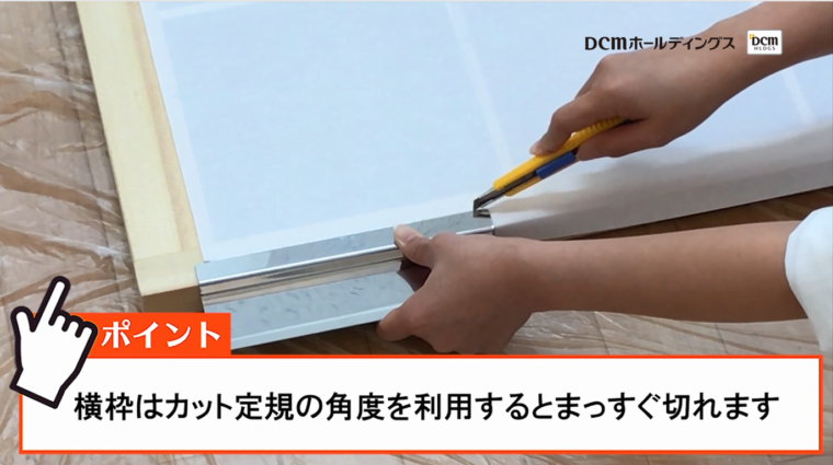 障子枠、桟を平らにするため、ヤスリで軽く削ります。障子枠や桟に汚れなどがついている場合、剥がれる原因になりますので、ヤスリで汚れや付着物を軽く落とし、表面を滑らかにすることで、両面テープがしっかり張り付きやすくなります。
