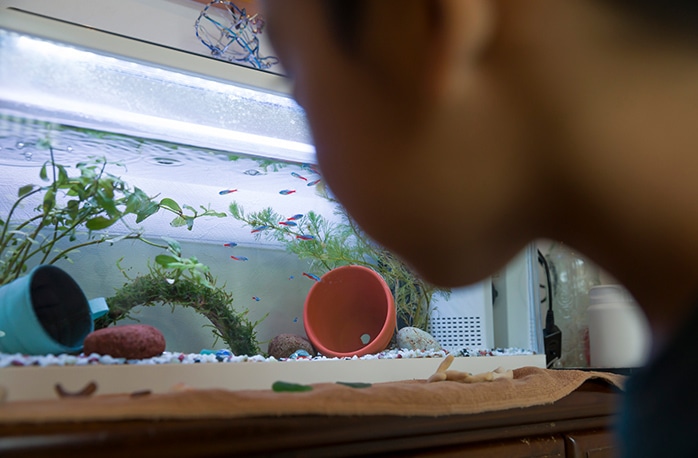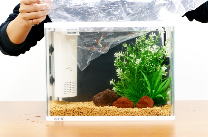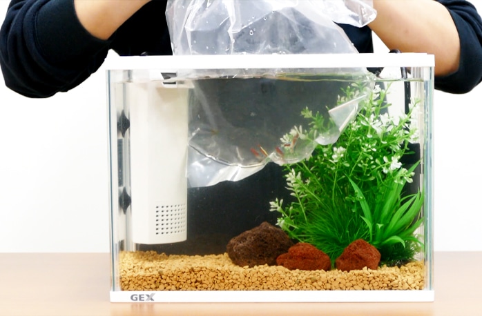 30分ほど経ったら、袋の口を開きます。そして、ここからいきなり魚を水槽に放すのではなく、空けた袋の口を水面につけて、ゆっくりと水槽の水と袋の水が混ざるようにします。魚たちが自分たちのペースで袋から出ていくまで、じっくりと待ちます。ほとんどの場合、1匹が外に出ると続いて出ていくようになります。