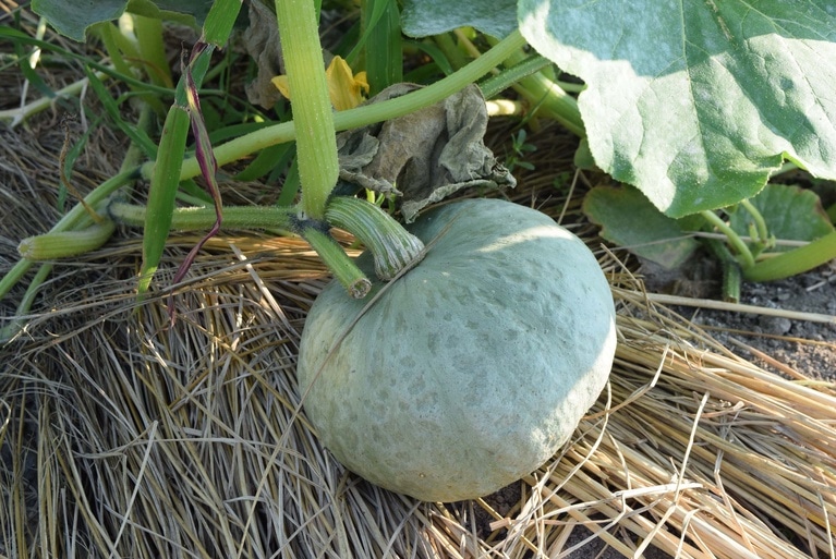 画像はかぼちゃですが、かぼちゃに敷きわらをすることで、ダンゴ虫からの食害から守られる効果もありますよ。