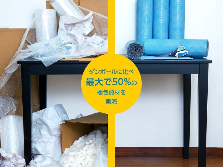 ダンボールや緩衝材、梱包用テープなどを用意する必要なく、本製品だけで梱包が可能。梱包資材を測定するわずらわしさも解消します。