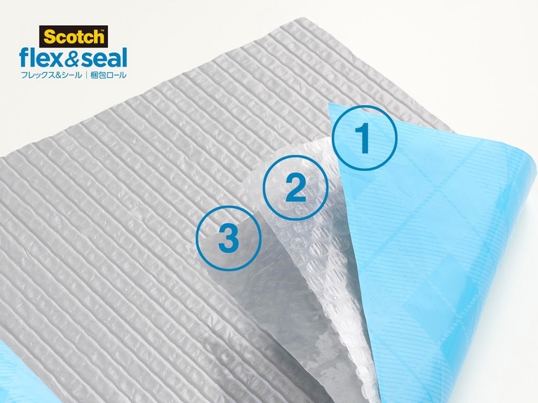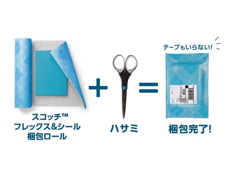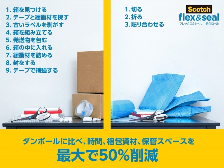 必要なものはスコッチフレックス&シール 梱包ロールとはさみだけ、フレキシブルなオールインワン梱包材料です。段ボールでの梱包に比べ、時間、梱包資材、スペースを大幅に削減します。