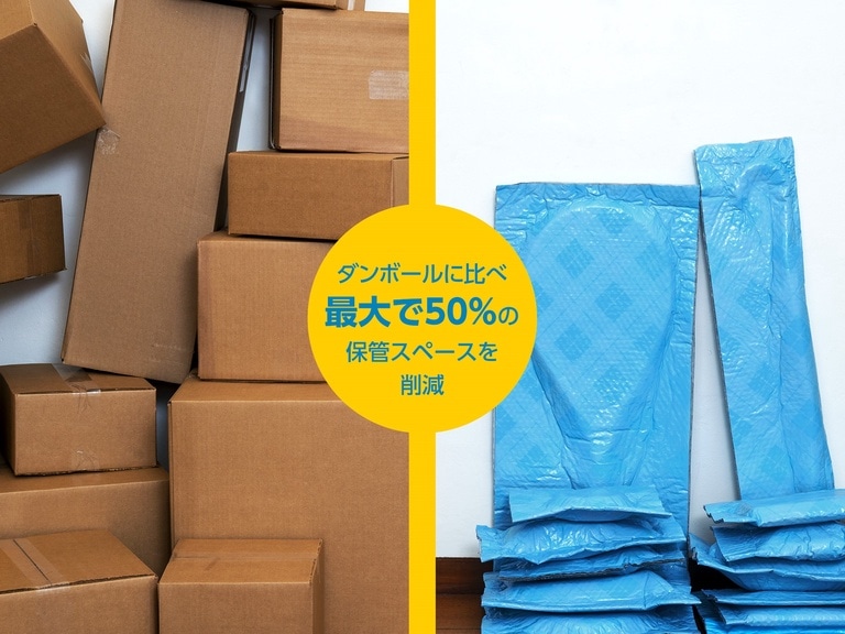 ダンボールでの梱包に比べ、時間、梱包資材、保管スペースを大幅に削減します。