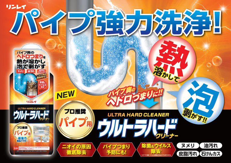 高濃度なアルカリ成分と熱・泡が持続し、パイプのガンコな汚れを徹底除去!