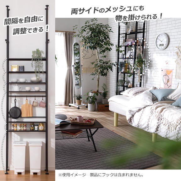 また、ラックの両サイドはメッシュになっているため、S字フックなどを設置でき、物を掛けることができます。