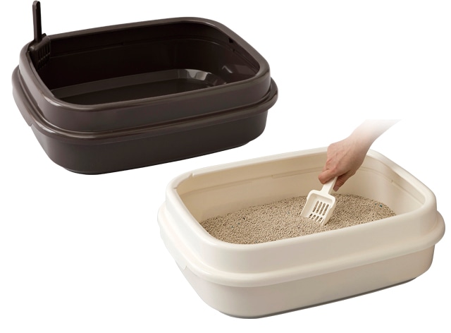 スコップ付き。猫砂の飛び散りを抑えるフード付きもございます。
