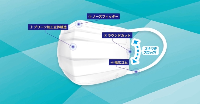 顔にフィットするよう設計された「ラウンドカット」が、マスクのスキマをしっかりブロックします。