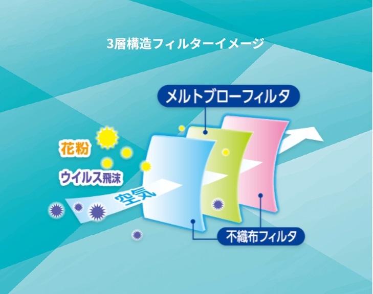 3層構造で花粉やウィルス飛沫を99%※ガード!微粒子ブロックフィルターが空気中の花粉、ウイルス飛沫、PM2.5までしっかりブロックします。