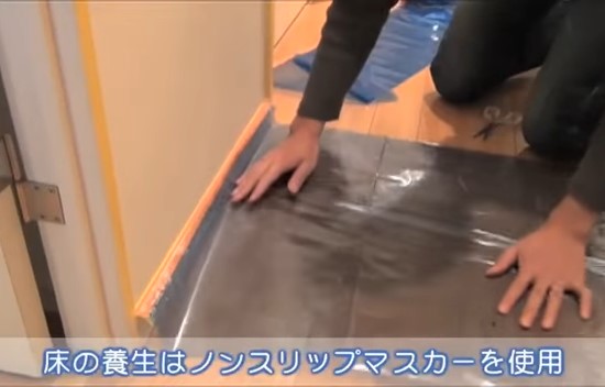 塗料が飛び散らないように床に養生シートを敷きます。足元なので滑らないようにノンスリップマスカーを使用します。