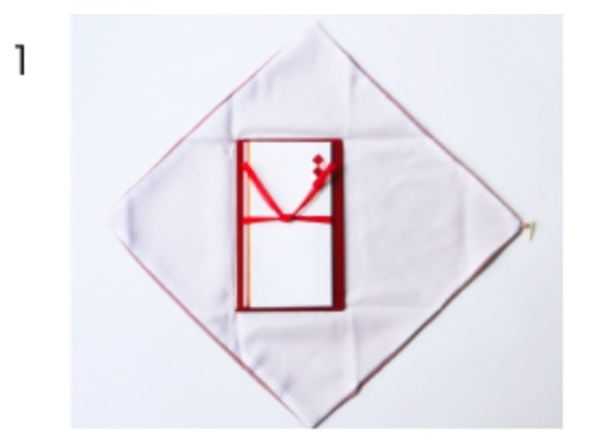 たたんだふくさは受付台に置くか、手に持ったまま台のようにして金封を上に乗せ、相手からみて金封が正面になる方向に持ち変えてから、両手を添えて差しだします。