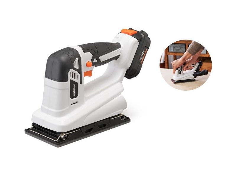 コードレスで広い範囲を短時間で研磨できる、充電式オービタルサンダ、ACアダプター・充電器、充電式リチウムイオン電池のセットです。サンドペーパーの番手(粒度)を変えることによって、荒削りから仕上げまでの研磨作業を行うことができます。市販のサンドペーパーも使用可能ですので、手軽に交換できます。ACアダプター・充電器、充電式リチウムイオン電池、ダストパック、サンドペーパー3種が付いています。