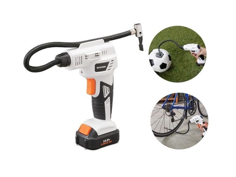 どこでも使えるコードレスタイプで、電動ですばやく空気を注入できる、充電式エアコンプレッサ、ACアダプター・充電器、充電式リチウムイオン電池、ノズル(3種)のセットです。3種のノズルは、タイヤ、ボール、浮き輪など、様々なものに対応可能です。現在の空気圧が表示され、入れたい空気圧も設定できるため、簡単に空気を注入できます。ACアダプター・充電器、充電式リチウムイオン電池、ノズル3種(自転車用・ボール用・浮輪用)が付いています。