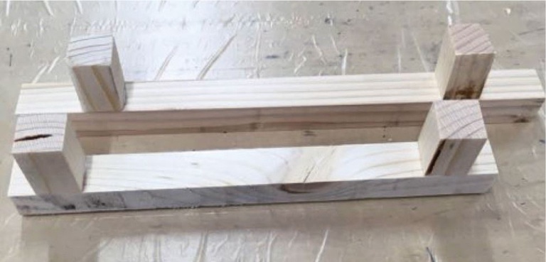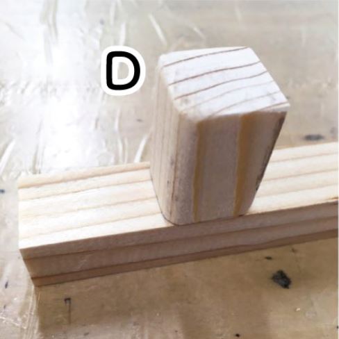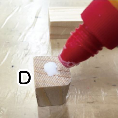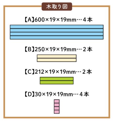 【A】2本と【B】2本で1つ、【A】2本と【C】2本で1つの木枠をつくります。それぞれビスでとめていきます。①で取り付けた【D】が外側にくるように取り付けます。
