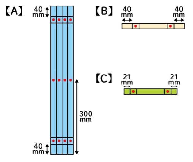 ②①で墨付けした【A】、【B】、【C】に下穴をあけます。