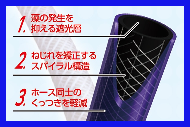 頻繁に使用しないと藻類が発生し、再度散水する際に目詰まりすることがありますが、ホース内部に遮光層を作り光を遮断することで、藻の育成を抑えます。