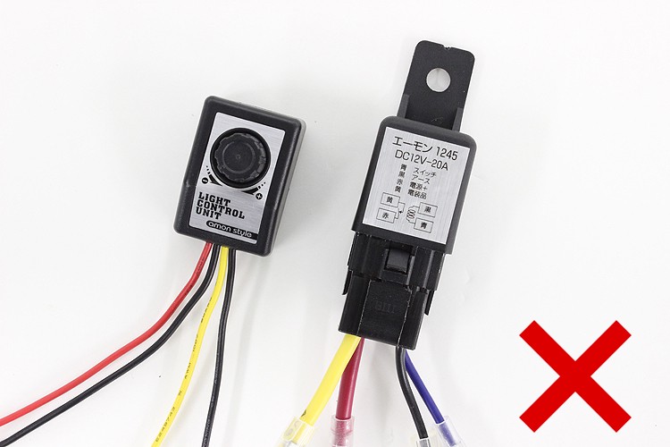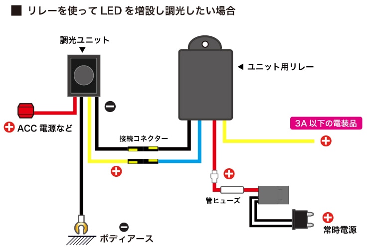 調光ユニットの電源をACCなどからとり、調光ユニットの出力(黄色配線)をユニット用リレーの入力(青色配線)に接続します。