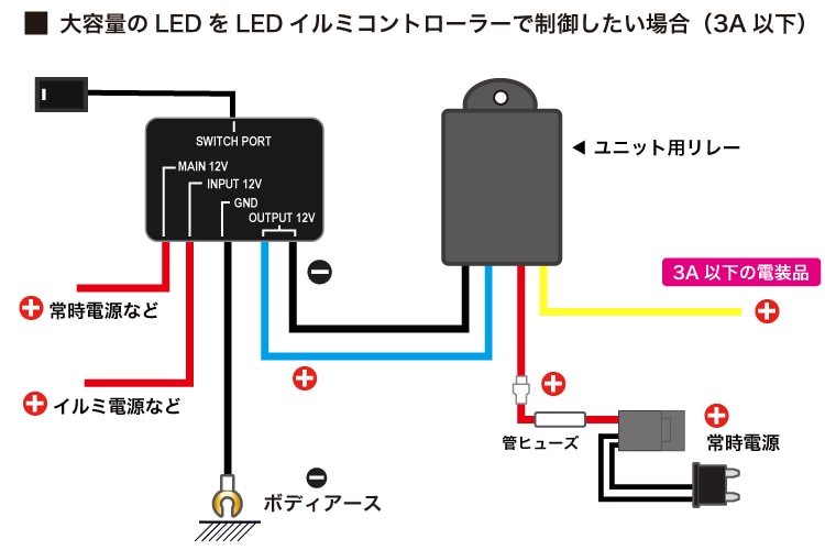 3AまでのLEDをLEDイルミコントローラーで制御したい場合の配線となります。