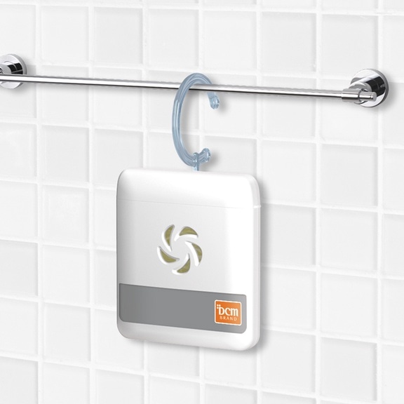 吊るしておくだけでカビの発生を抑える成分が浴室内に広がり、さらに除菌・消臭までしてくれます。浴室内のポールなどに設置できる、便利な吊り下げフック付きです。