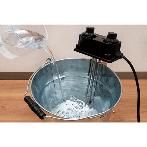 使用機種、水量や温度にもよりますが、時間経過により水温が約60℃まで温められます。温め終わった後は、金属、石、耐火物の上でヒーター部分を完全に冷やします。