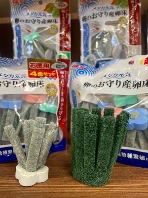 この商品を良く見ると、緑色のスポンジにふわっとした白い繊維が混ぜ込んであります。まるでホテイ草の根っこの繊維のように、卵が絡みつきやすくする工夫です。そして、もう一つの特徴はその「やわらかさ」です。スポンジ自体も専用開発しているので、メス親にもやさしく、水を含みやすい素材に仕上げています。卵が産み付けられているかを確認するときにも、卵を乾燥させたくない、そんな開発者の想いが込められています。100円ショップに売っているような、家庭用のスポンジは繊維が固く、メス親を傷つけてしまうかもしれない、そんな心配がなくなりました。
