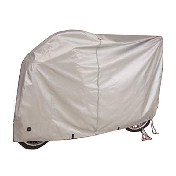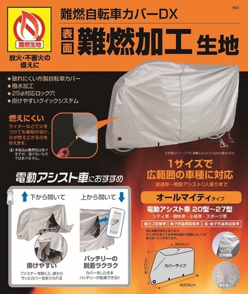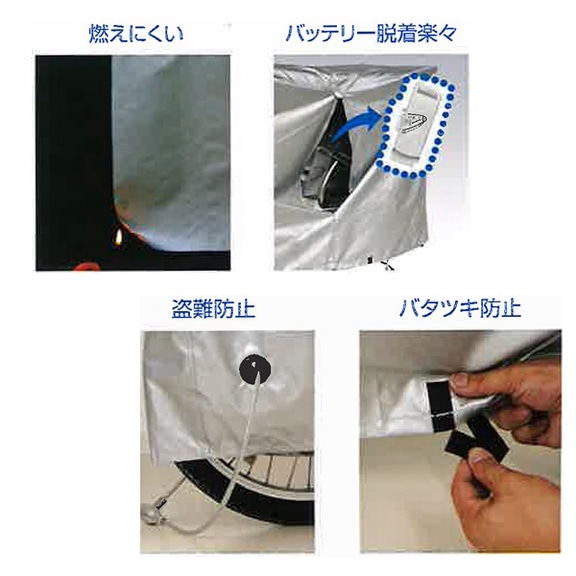 難燃性加工生地を使用し、燃えにくい自転車カバーです。<br>駐輪時のホコリや雨を防ぎ、放火からも自転車を守ります。