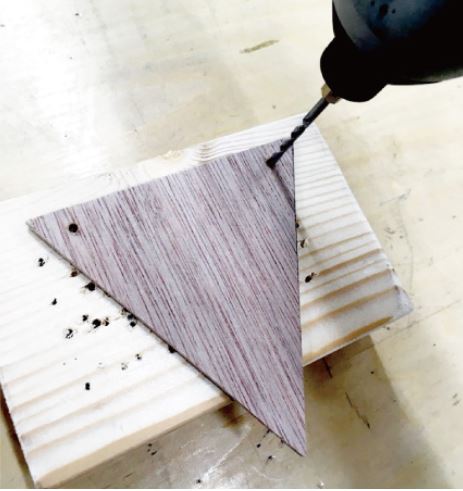 電動ドリルドライバーで麻紐を通す穴を開けます。(3mm~3.5mmのドリルビットを使用)穴を開ける板の下にあて板をすると、机を傷つけることなく、穴あけができます。