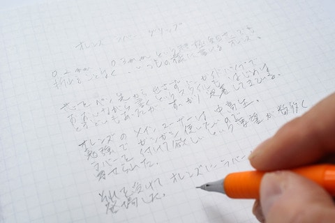 書きはじめるとじわりじわりと感じてくるのが、書き味のスムーズさ。従来の「オレンズ」よりもほんのわずかなレベルだがスムーズさを感じた。これは私の勝手な想像だが、紙の繊維という細かな凸凹を芯先が走る時の振動がラバーグリップが吸収してくれているのではないかと思う。