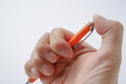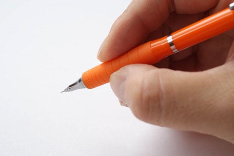 小さな文字を書く時は、グリップのちょっとした握り心地が筆記に影響を与えてしまう。今回のラバーグリップはすべらずしっかりと握れるので、そのコントロールがとても快適にできた。超極細「オレンズ」ライティングをより楽しめるタイプだ。