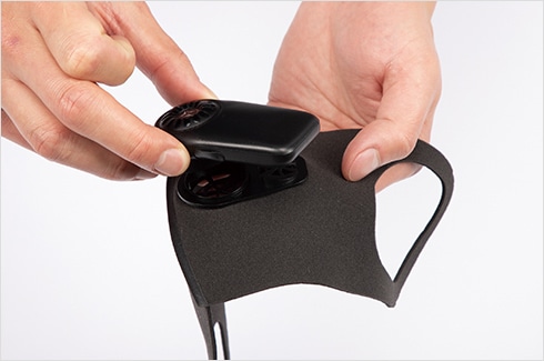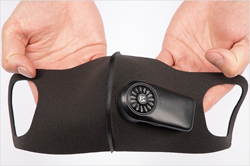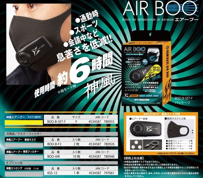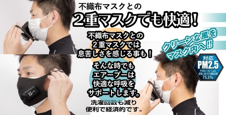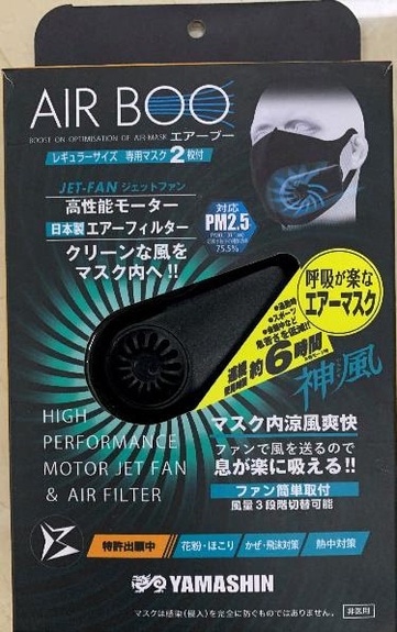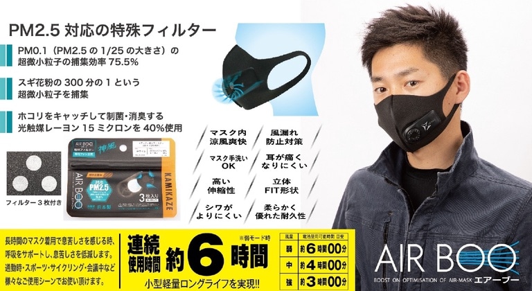 マスク内涼風爽快!<br>ファンで風を送るので息が楽に吸える!!<br><br>JET-FAN高性能モーター、日本製のエアーフィルターでクリーンな風をマスク内へ送ります。<br><br>高性能モーター『JET-FAN』搭載!日本製エアーフィルター採用!PM2.5対応しています。<br><br>通勤時、スポーツ、会議等々、様々なシチュエーションで息苦しさを低減します。