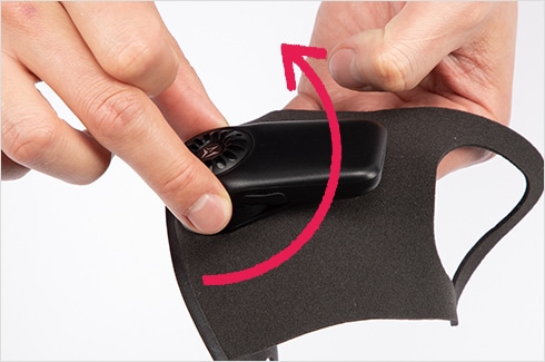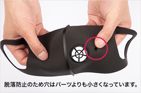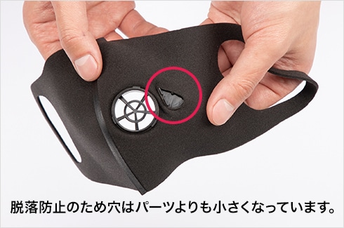 大きな穴側へ、マスク側面を穴に当て、はめ込みます。