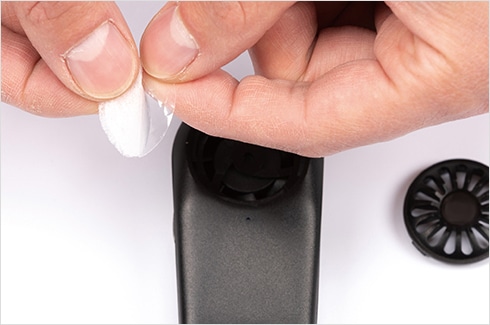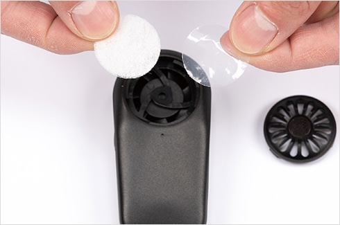接続パーツBを、マスクの外側から取り付けます。