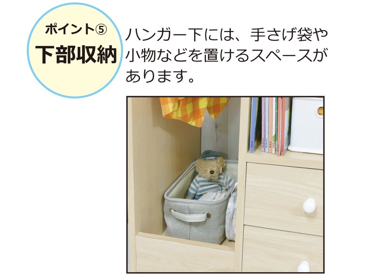 ハンガー下には、手さげ袋や小物などを置けるスペースがあります。